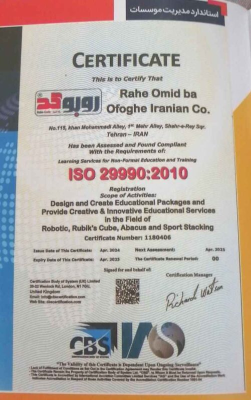 « روبوکد » به شماره ثبت 44174 موسسه ای است كه در زمينه ارايه خدمات آموزشی همچون آموزش رباتیک، روبیک، خلاقیت، لیوان چینی، چرتکه، هوافضا و سازه های ماکارونی فعاليت دارد.